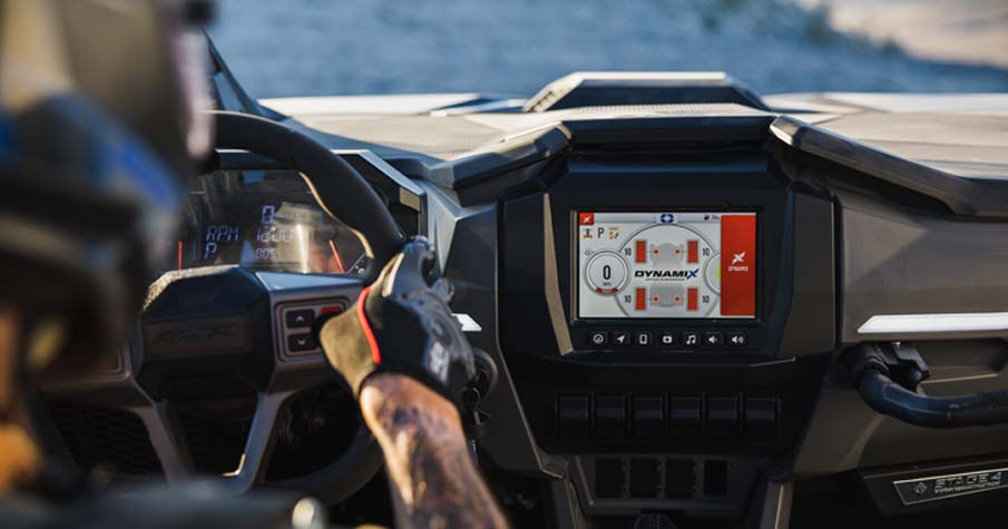 - RIDE COMMAND® 7” Glove-Touch Display: DYNAMIX 2.0 Visualizer, Built-In GPS, Group ride (cell-based or GPS based), Topographic Mapping, Bluetooth & USB Smartphone Connectivity, AM/FM & Weather Radio (Accessory Speakers Required - Sold Separately), In-Vehicle Communications Capable With Optional Sena Headsets, Polaris P.A.S.S Anti-Theft System. Dual-sweep Analog Dials w/ 4" LCD Rider Information Center: User Selectable Blue/Red Backlighting & Brightness, Programmable Service Intervals. Digital Instrumentation: Speedometer, Tachometer, Odometer, Tripmeter, Clock, Hour Meter, Gear Indicator, Fuel Gauge, Coolant Temperature, Voltmeter, Service Indicator and Codes, Seat Belt Reminder Light, Gear Indicator, DC Outlet.